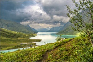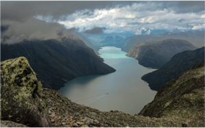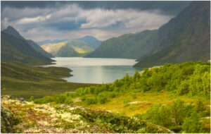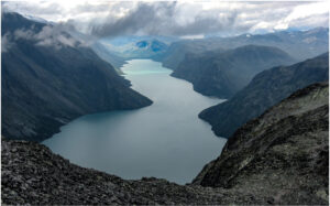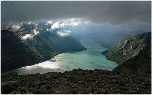 En vandretur i Jotunheimen september 2006 startede fra Gendesheim med en fin udsigt til Gjende i varmt septemberlys under opstigingen til Besseggen. På vej op sank skyerne ned og gjorde alt gråt og vådt, men netop fremme ved nedstigningen over Besseggen kom der huller i himlen og afslørede et voldsomt og dramatisk landskab. Mit lille Ixus 800 kamera var begejstret. Herlig start på en god uges vandring i Jotunheimen.