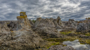 Kystlandskab på det nordvestlige Fårö med et stort område med “rauker” dvs. stenformationer, der har modstået havets erosion af blødere bjergarter. Ofte med en mængde store fossiler.
