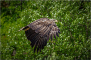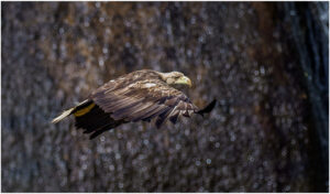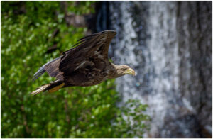 Det viste sig at man kunne komme endog meget tæt på ørnene. Faktisk var min 600mm optik ofte for svær at “fange” fuglene med. Men det blev dog til nogle enkelte udmærkede skud. Bl.a. flere, hvor ørnen flyver ind foran et lille vandfald.