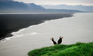 Ingólfshöfði er en lille ø man kan blive kørt over til på en traktortrukket vogn gennem enge og lavt vand.